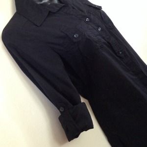 A military utility look with collared neck. Roll the long sleeves up to any height. Theres a small fabric strap that comes out at the arm that helps secure the sleeve length with a button. (See 3rd picture) ..Same buttoned fabric strap style holding down each chest pocket. Two belt loops sewn on, one on each hip side. 100% cotton. last button 6 1/4" from seam NWOT