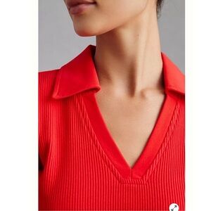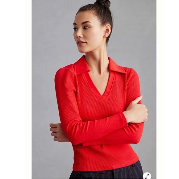 Anthropologie DOLAN Ribbed V-Neck Top in Red. Ribbed, v-neck collared top that fits like a glove. Mid-weight with supportive stretch, perfect length for the option to tuck it in. Contrasting smooth collar and neckline trim. Classy for work or play. Pullover styling. Rayon, elastane. New without tags, unworn.