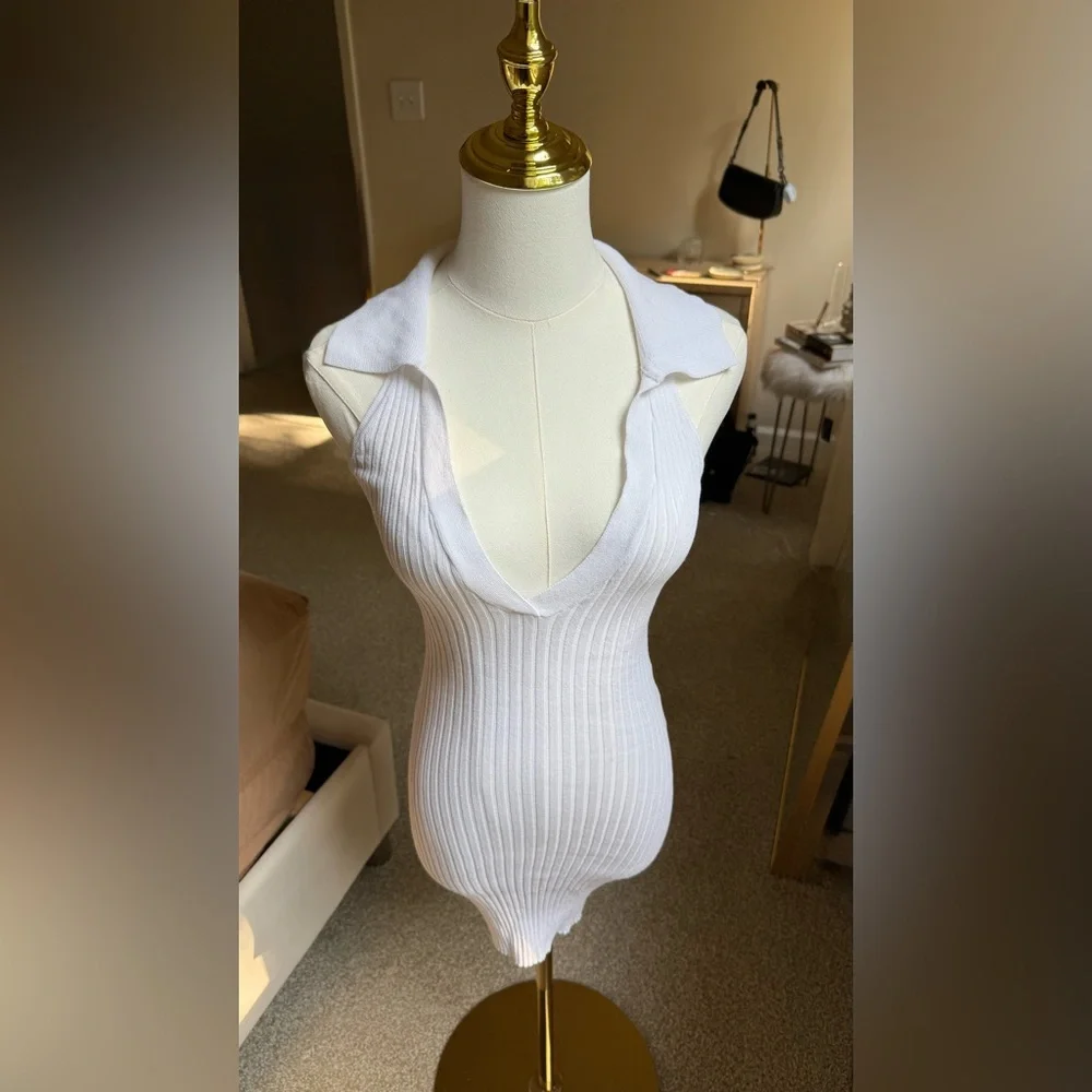 Step out in style with this elegant white backless ribbed dress. Perfect for any occasion, it offers a chic and comfortable fit.