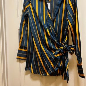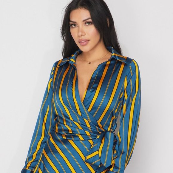 Multi-striped satin collared surplice wrap top with self-tie. A great top to compliment any pair of jeans. Runs true to size