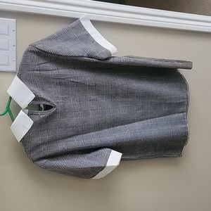 Love this but needed a bigger size for myself. Professional look with white collar and white trimmed sleeves. Checkered herringbone print is black. Lightweight fabric. Never worn!