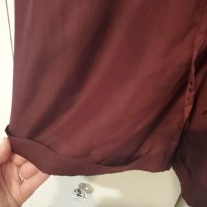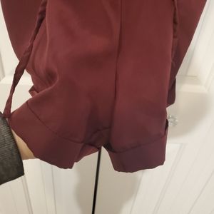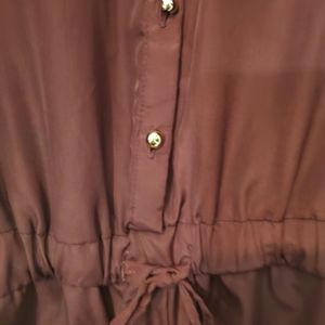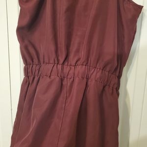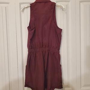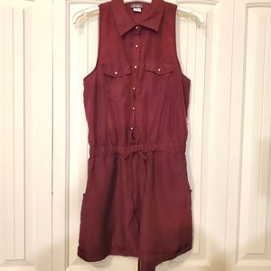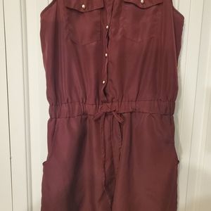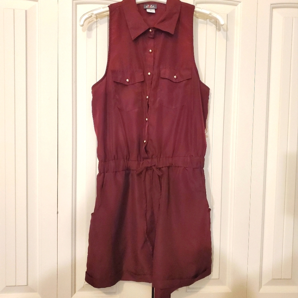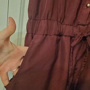 collared button down romper with pockets, gold accents, hood condition, singed at waist, burgundy color