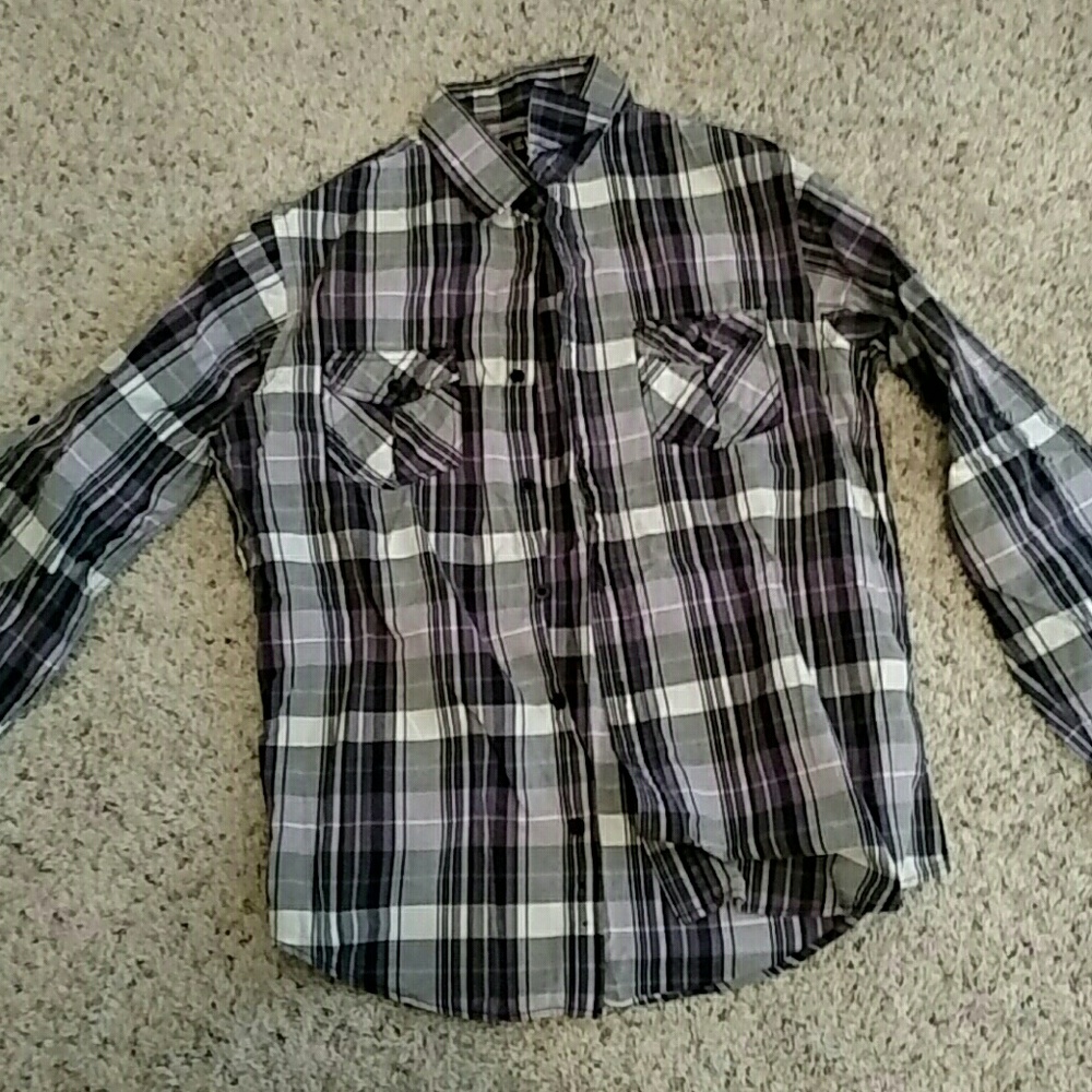 Purple, black, and white plaid. 2 breast pockets with buttons.