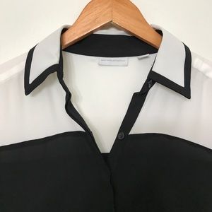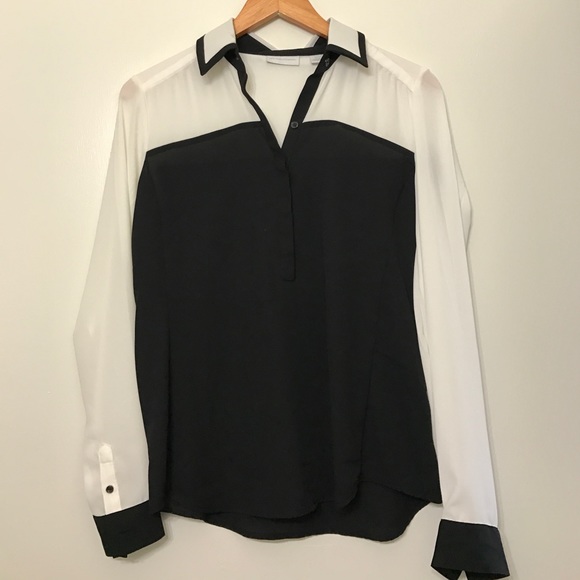 Black with white top and arms. 100% polyester. Buttons up half way. Great for professional attire.