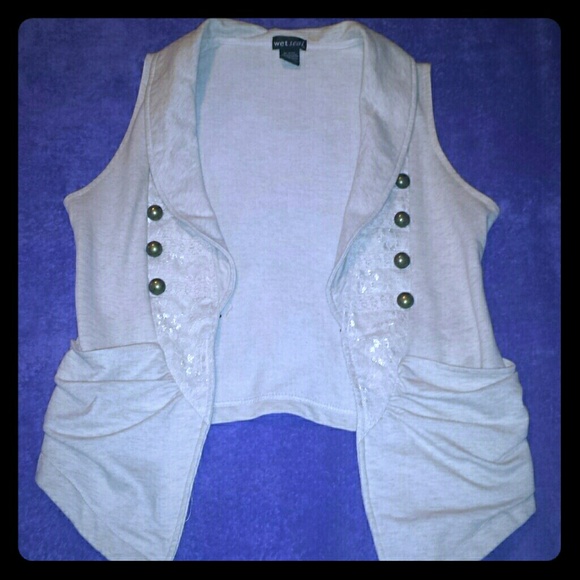 Sleeveless, Beige, collared cardigan with pockets. Vintage looking buttons on the sides with lace.