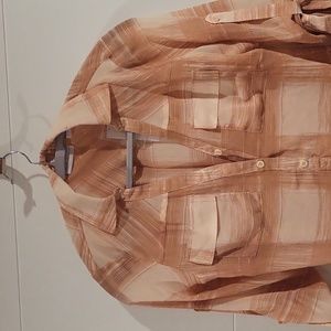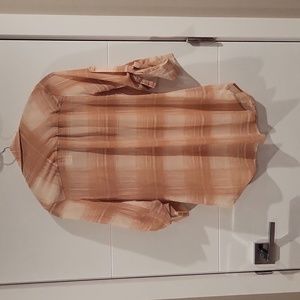 peach plaid collared half botton down tunic top. very light weight material.