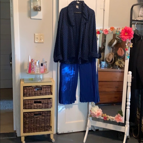 Royal blue and Black polka dot ruffle collared jacket with royal blue palazzo pants will put style and function into your wardrobe. This can be worn with a tank underneath and can be dressed up or down.