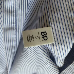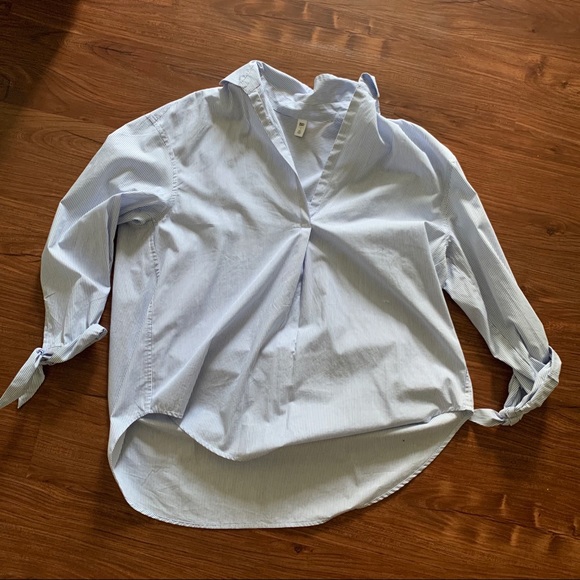 Collared striped oversized shirt. Ties on sleeves to make them adjustable. No buttons, v neck in the front. Never worn