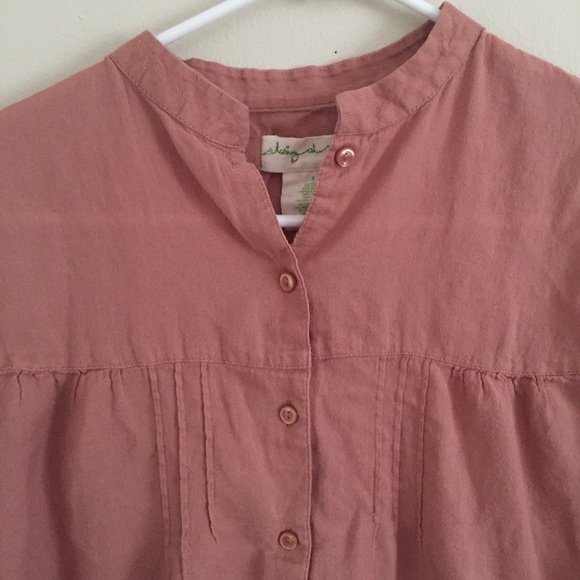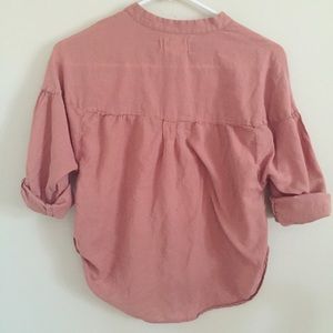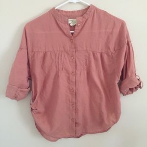 Dusty rose 3/4 sleeve collarless button down with roll tabs at the sleeves and the hips.