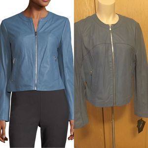 Collarless Zip-Front Leather Jacket