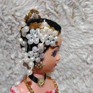 this doll is lovely , she has her own stand that her little shoes slide into , it is removable. there is a mark (scratch) on her cheek, see pics . there's a blue mark on her eyelid. she's only abt 7 inches tall but there's so much beauty packed into that 7 inches. she's just stunning. see all pictures for details. there may have been a pendant at the end of the necklace that's missing. I have other dolls in my closet, bundle and save $$$