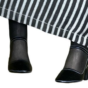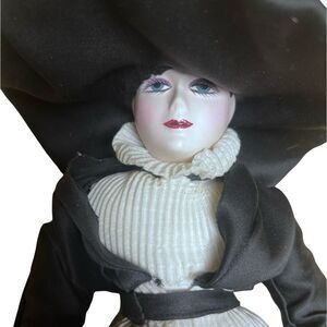 This is a vintage Charles A. Berry Eliza Essex Porcelain Doll. The doll has porcelain lower arms and legs with a cloth body. She is wearing a black top and striped skirt and it also comes with a black hat and velvet tube piece. The doll also has the tag on the wrist and certificate of authenticity. This doll is in very good condition with no chips or cracks
