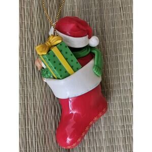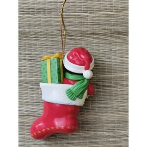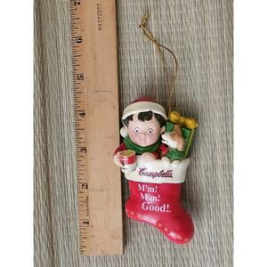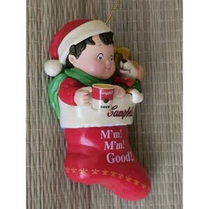 Well taken care of ornament, no scratches, etc. Very collectible and cute with Campbell's kid drinking from a mug well tucked into a Christmas stocking with his puppy. Please review each photograph provided as our pictures are always an important part of our descriptions.