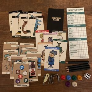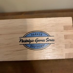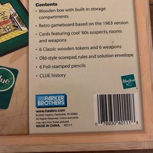 Wood box / case Clue board game by Parker Brothers. Part of the 2002 Nostalgia Game Series. Missing two original pencils, about three pages used from tablet, some other marks and wear, but overall good condition. I think, it came with two dice originally, but only has one. Great used condition overall.