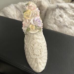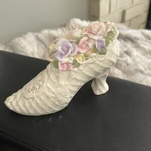 Beautiful, collectible, decorative shoe with pastel florals and yellow lavender and pink. High gloss finish perfect condition with no cracks ships or repairs.