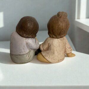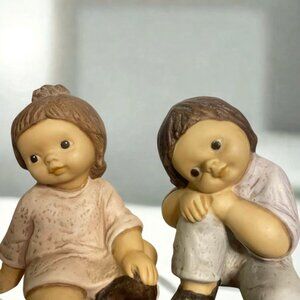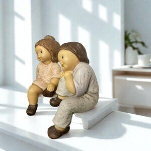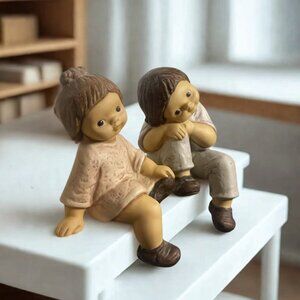 This adorable set features two genuine Goebel Nina Marco figurines, a highly desirable pair that captures the innocence and charm of childhood. They are crafted from fine German Porcelain, a detail highly valued by collectors. These collectible figures are designed to sit charmingly on the edge of a shelf, mantel, or dresser, known as "shelf sitters." The set includes one girl in a pale pink dress and one boy in light pants, both with sweet, expressive faces.