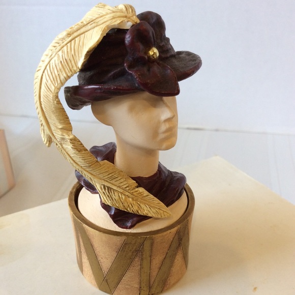 This resin collectible is about 4 inches tall with a place to put small earrings or rings. Really cute way to give a gift of jewelry or as an addition to a dresser top. In the original box.