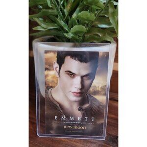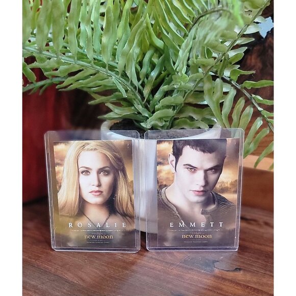These are official The Twilight Saga: New Moon trading cards, featuring photos from the movie of Rosalie Hale and Emmett Cullen. They were released by NECA in 2009 in correlation with the release of the film in theaters and are no longer in production, making them highly sought after and collectible. Please see the provided photos for further details (props not included).