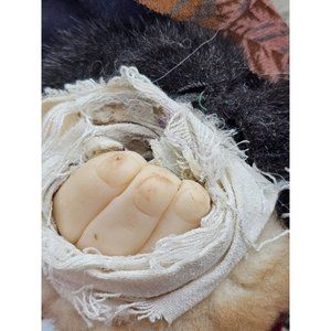 This OOAK Collectible Artisan Santa Elf is a one-of-a-kind handmade doll by Misha Contemporary Dolls. It comes with a COA for authenticity. The doll is a Santa elf doll, measuring 35 inches in size, and belongs to the category of dolls, clothing & accessories, and dolls & doll playsets. This Santa is so unique with his sack of quartz, tiger eye and pyrite. Santa is also carrying a baby Santa under his cloak! This has been handcrafted and is an original design. Measures approximately 35" long laying flat. Santa is missing something from his right hand- possibly another quartz stone. There are also a few glue spots on his left foot. Pre-owned in very good condition. Such an interesting piece.