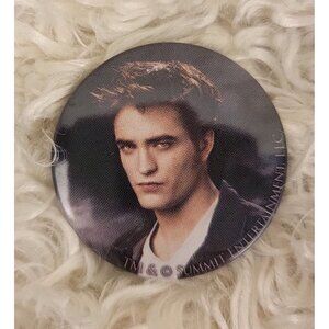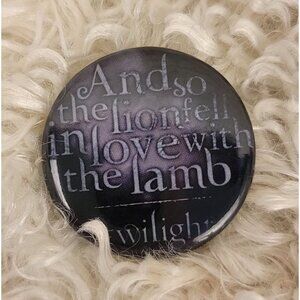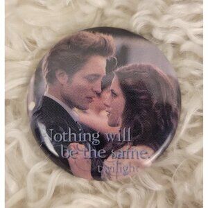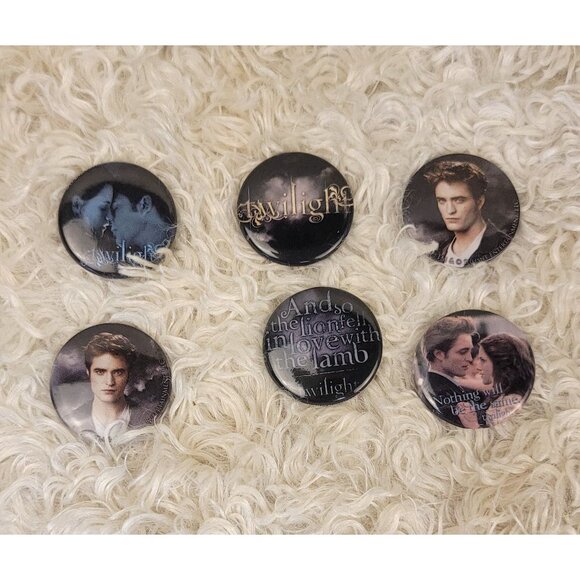 These are a set of six collectible pin-back buttons from the Twilight movie, featuring Edward Cullen, Bella Swan, the movie logo, and one pin includes the famous quote from Edward, "And so the lion fell in love with the lamb." Another pin has the text, "Nothing will be the same." These pins are no longer in production, making them highly collectible for any true Twilight fan. Please see the provided photos for further details.