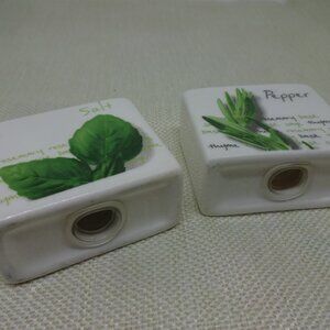 Collectible White Ceramic SALT & PEPPER SHAKERS with SPICE DECALS (euc)