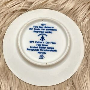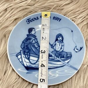 Cute blue and white porcelain plate from Norway depicting father and child fishing. Says father’s day in German.