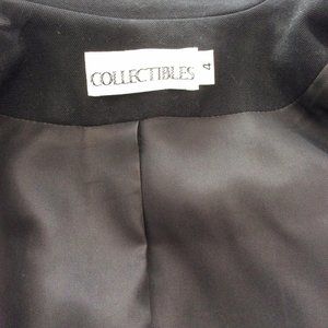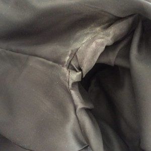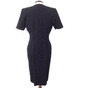 This beautiful dress looks very polished and professional. It is black with cream detailing and cream and gold buttons. It is fully lined. See the last photo for slight underarm staining (on the lining only). The approximate measurements are: