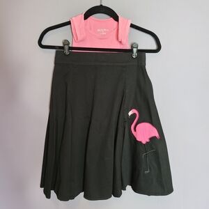 "Poodle Skirt" style, but with a flamingo! Vintage inspired black skirt, sturdy cotton with back zipper enclosure. Unfortunately, no pockets. Waist measures at 25 inches; fabric doesn't have a lot of stretch, but there's wiggle room in the waist measurement depending if you wear it higher or lower. Pink tank top included, size small. Skirt is a size small as well. Feel free to leave questions in the comments, thank you!