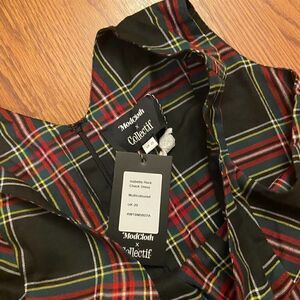 Black plaid sleeveless high low midi dress with sweetheart neckline. Red, green, yellow & white plaid pattern. Perfect for Christmas or a holiday party. Pictured is the UK size chart from the ModCloth website and a UK/US conversion chart I found online.