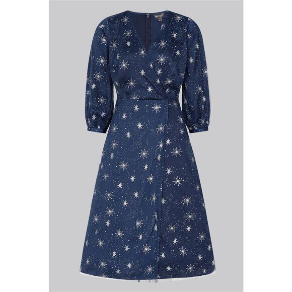 Brand new in original package.The Pixie Star Dress is a festive dream! With faux wrap front and gorgeous slightly bell sleeves, this navy number is the perfect party dress. It features beautiful silver glitter stars on a mesh overlay, falls just below the knee and is fully lined.