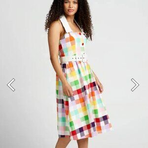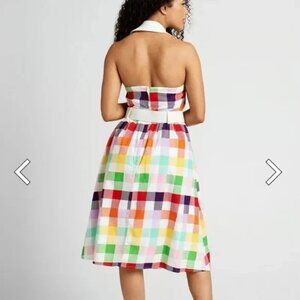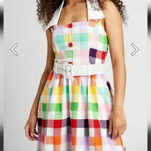 With a 1940’s flair, this striking halter dress from UK brand Collectif is such a fabulous fusion of old Hollywood glamor meets modern-day rainbow prints! Made from a lightweight woven fabric in a plaid gingham print mixed with both warm and pastel shades of yellow, green, blue, purple, pink, and red atop a contrasting white background, this sleeveless swing dress features a halter neckline with a white winged collar, red button closure at the fitted bodice, a white faux-leather belt at the high-rise gathered waistline, and an ample swing skirt with handy side pockets. Back zipper with hook and eye closure. Comes with white adjustable belt.