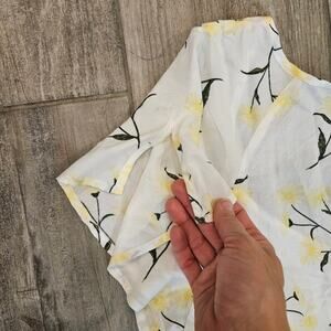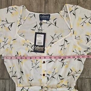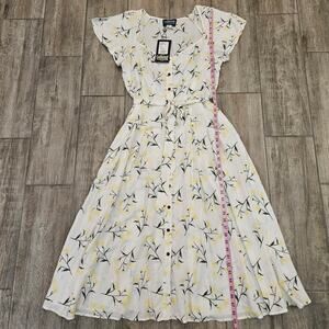 Collectif Vintage Caterina swing dress in a white and yellow floral print, women’s size L, new with tags. Features a fit-and-flare silhouette with button front, short flutter sleeves, belted waist tie, and flared midi skirt. Lightweight and breathable fabric with a vintage-inspired charm. Perfect for spring and summer wear or retro-themed occasions.