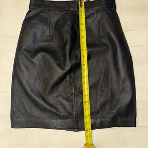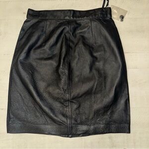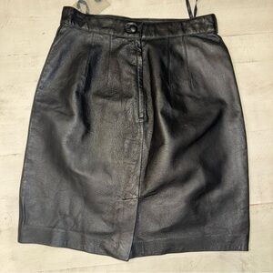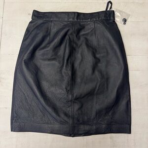 Sleek black leather pencil skirt. Perfect for a sophisticated look.