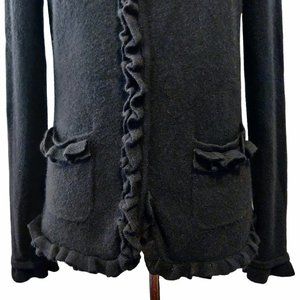 Good condition, minor signs of wear, no rips, holes or tears, nice, soft cashmere cardigan, ruffle trim details, front pockets, snap closure