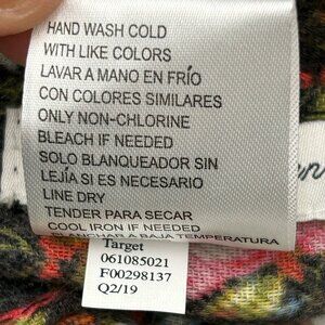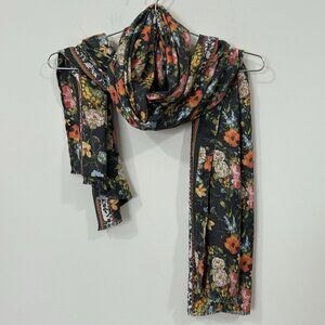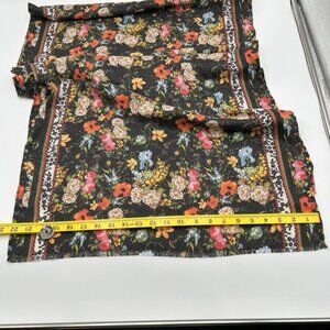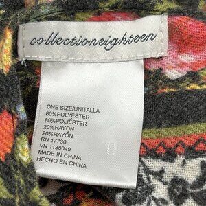 This lovely Collection Eighteen floral scarf combines cozy comfort with timeless style. The background appears to be charcoal gray, accented with a multicolor floral print featuring tones of pink, yellow, orange, white, green, and blue. Along each long edge runs a wide coordinating stripe pattern that frames the design beautifully and adds extra visual interest. The fabric is somewhat thin and lightweight, offering a soft, breathable feel — not see-through except when held up to strong light. Made for Target, this piece has a soft, luxurious texture.