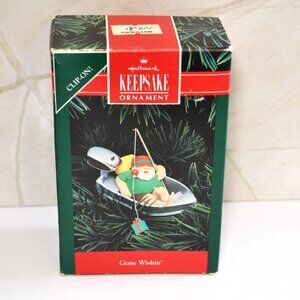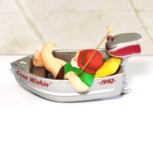 Selection contains several mini size ornaments, a Hallmark ornament Gone Fishin' 1992, and a glass ornament of a bear on a fish.