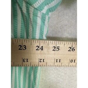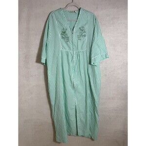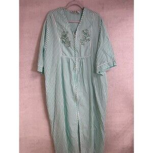 This is a Collection ETC women's house dress in size 2XL, featuring green stripes and made of 100% cotton. It has long sleeves, a full zip closure, and falls to a long dress length in an A-line style. The dress is designed for casual occasions and includes zipper accents, making it a comfortable and stylish choice for everyday wear.