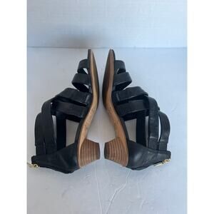 Cushion Plus technology. Black Leather upper and soles with wooden heels 1.5” approx height. Cross strappy sandal. Zipper back closure