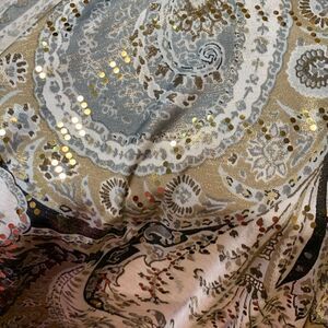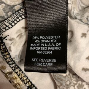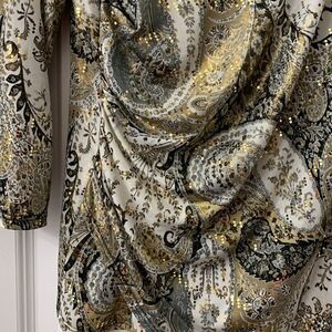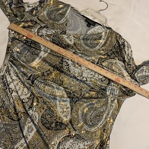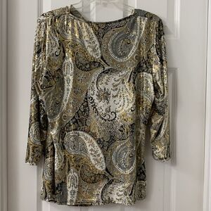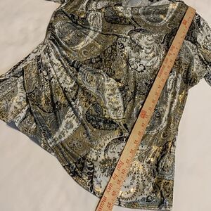 Collection by Dressbarn size 1X woman asymmetrical pullover blouse. Browns, tan and cream with gold detail dots. NWOT Smoke free & Pet free home. See ALL photos for complete description/details.