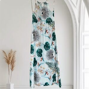 Elegant maxi dress with a vibrant tropical floral print. Features lush green leaves and colorful flowers on a light background.