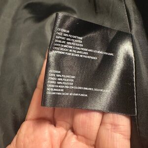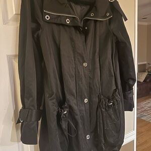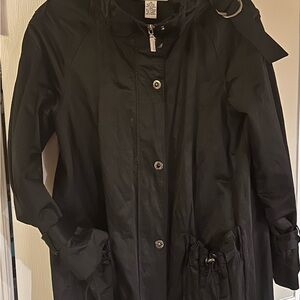 Exclusively Bloomingdale’s collection fifty nine Sophisticated black outerwear for a refined style. Loose and fun. Nylon and polyester outer shell with front zipper and cool snaps up front. Buckles on shoulders and sleeves. Drawstring pockets and bottom of jacket for snugger fit with hipper look.
