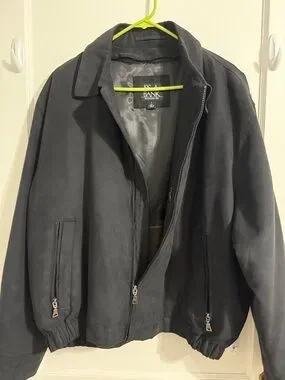 Soft suede exterior with a smooth interior lining. Plaid lining. Full zip front with zippered hand pockets. Elastic hem for a snug fit. Clean, minimal design suitable for casual wear.