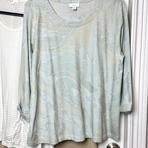 Collection of three pieces of ladies clothing. 1. J. Jill marble dyed swing top size L Petite and measures approximately 26" L from shoulder to hem, 22.5" pit to pit. 2. Heartstring off white cotton blend top, size L. Measure approximately 28" L from shoulder to hem and 22" pit to to pit. 3. A pair of silk & linen pants from Coldwater Creek, pull on with drawstring, wide leg. Measures approximately 16.5" flat at waist and 26" inseam.