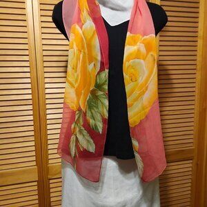 Collection of 5 scarves made of 100% Silk. They are all new, never worn scarves. Size varies for all scarves, as can be seen on mannequin which is 5’ tall.