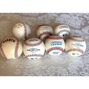 Three balls feature the commissioner’s signature and premium leather construction—crafted to the same specs used on the field. One is a GIANTS Ball. One Ball has 2 signatures: Doug Sisk-who pitched in the Majors with the New York Mets from 1982-91, and New York Mets Closer Jesse Orosco. The seventh ball is a plain Rawlings ball.