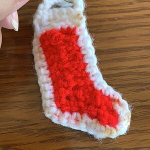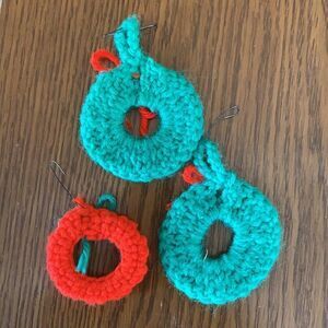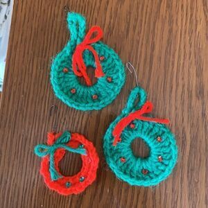 Collection of kitschy handmade yarn Christmas tree ornaments