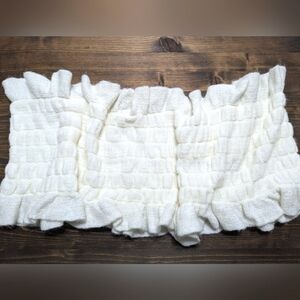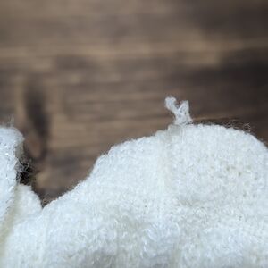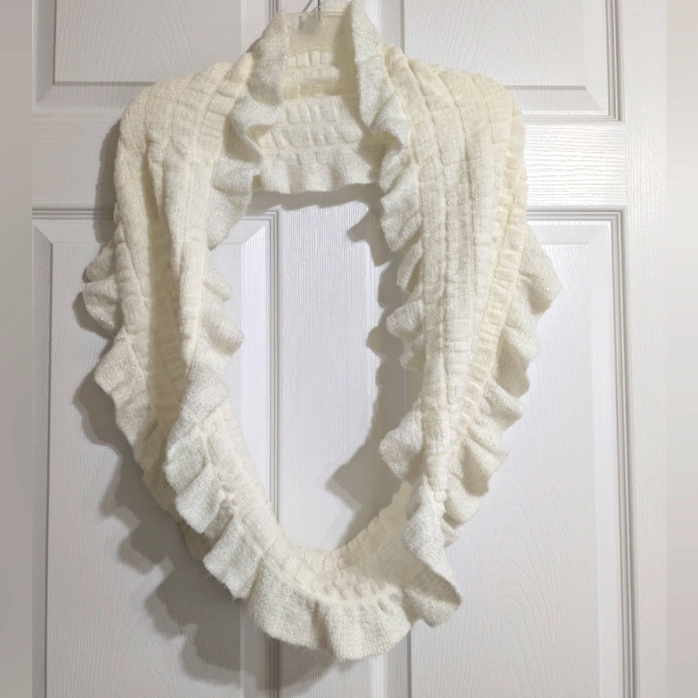 GUC women's cream/off white color infinity scarf with sparkly silver threads in the ruffle trim. The last picture shows a minor pull on the inside of the scarf but no other issues noticed.