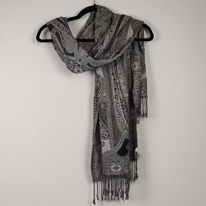 Collection Eighteen Metallic Floral Fringed Wrap Scarf in gray and black with gold metallic threads. The perfect wrap to complete your fabulous outfits. Super soft, lightweight and loose weave in 89% rayon, 8% polyester and 3% other fibers.