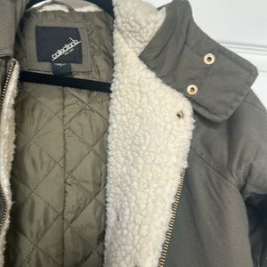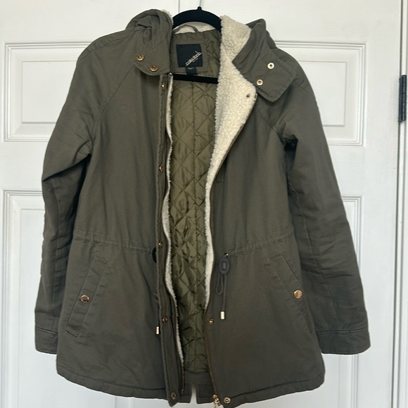 This jacket is in great shape and only worn a few times. The jacket is quilted lined and then fleece lined at the front and hood. It’s more of an olive green color.