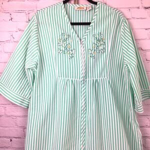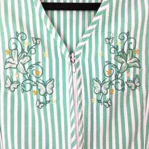 Collections Etc Floral Embroidery V-Neck Full Zip Short Sleeve Slash Pockets House Robe Green White Striped Women's Size Large